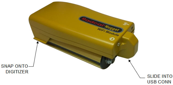 Align the USB connectors and slide the Nugget all the way in. (To remove it, pull out the connector first then unsnap it by tilting it upward or sliding it off the end of the digitizer.)