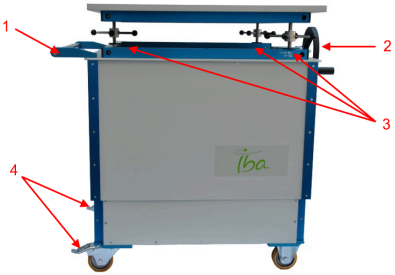 platform, 3: Handles for horizontal leveling, 4: Wheel locks