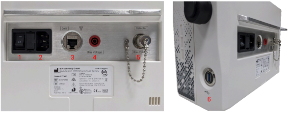 4: Bias Voltage Output (4mm bunch plug) used to optionally provide bias voltage to detectors (see Floated vs. Grounded Input).