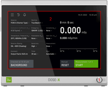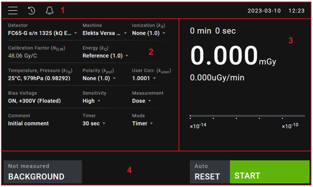 From the main screen of the DOSE-X the user can see the current detector, settings, and measurement, as well as take new measurements.