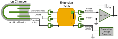 polarization potential, and needs an isolating amplifier to provide analogue output. The extremely low current, initiated inside the chamber by radiation, forces the use of high sophisticated guarding techniques, in order to make the entire system (chamber, cable, connectors and amplifier) usable in clinical routine.