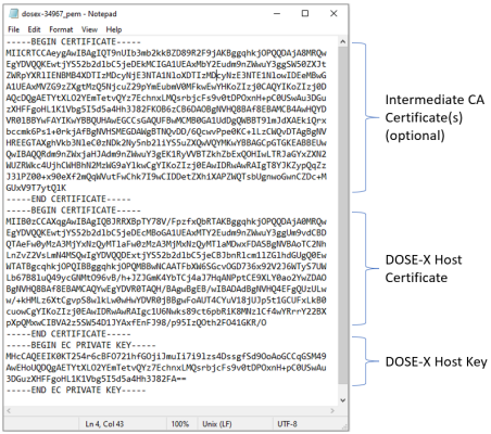 The intermediate certificates (if any), the host certificate, and the key (host key) for the DOSE-X need to be concatenated to a single file, in *.pem format.