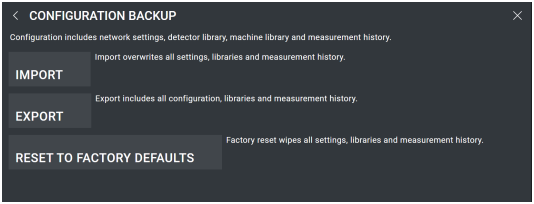 - To create a backup of device settings, detector and machine libraries, and measurement history, tap the EXPORT button.