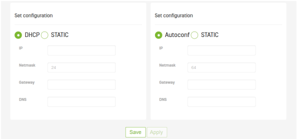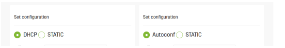 - In the Set configuration group, select the DHCP (selected by default) or STATIC round button for the IP address configuration.