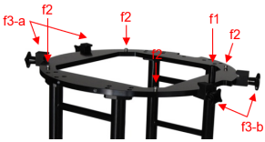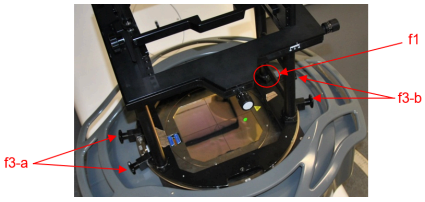 Please note, there is little room for movement in the crossline direction as the fixture bolt fits snugly into the white plastic hole. However, there is noticeable room for movement in the inline direction. - Turn the two knobs to fix the two clamps (f3-a) far away from the fixture bolt simultaneously. Then fix the other two clamps simultaneously (f3-b). Check that all 4 clamps grip to the ring properly.
