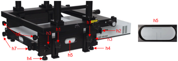 h1: Side knobs for adjustment clamps, h2: Detector locking pins, h3: Side screws, h4: Bottom knobs, h5: Window, h6: Upper back clamps, h7: Lower back clamps.