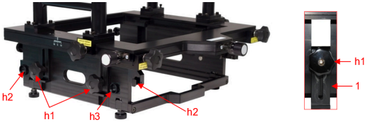 - Loosen the four side knobs (h1), move the clamps (1) so that there is enough space for the detector and the build-up plates to be inserted, and then lock the fixation knobs again.