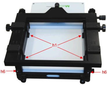 plates can be placed under them. - Place the plates on the top of the MatriXX from the rear side of the holder, Lock the plates from above with the four clamps h1 by moving the safety clamps (h1-b) tightly on the plates and fixing them with the four knobs (h1-a).