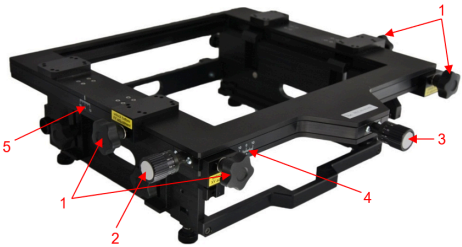 - Adjust the X and Y directions by turning the X and Y-adjusting knobs (2 and 3), respectively. There are two printed scales (4 and 5) on each side of the table. The knobs are graded in 0.1 mm increments; one full turn is one millimeter. Maximum adjustable length is ± 10 mm.