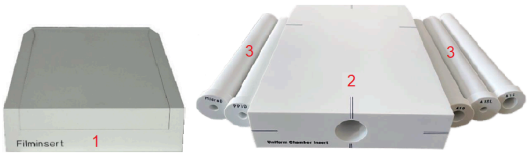 Examples of inserts; 1: Film insert; 2: Uniform Chamber insert; 3: chamber adapters