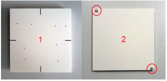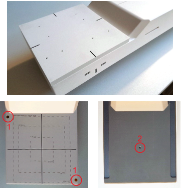 The topside (1) of the fiducial plate has 8 stainless steel pins (2 mm in diameter) and alignment markers. The bottom (2) of the plate contains two alignment pins to affix it to the myQA SRS Cyberknife detector.