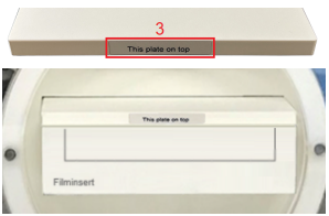 Please note, this plate has no fixation pins. To ensure proper placement, the plate has a "This plate on top" label (3). When using this plate with the inserts, please ensure that the dummy plate is on top of the insert.