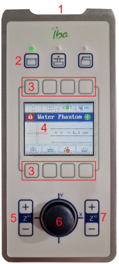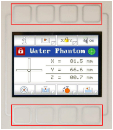 There are eight soft keys used to open the menus, which are defined by the icons below or above in the display. The figure example shows the main display of the water phantom mode. It includes the soft key menu icons and water phantom menus.