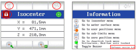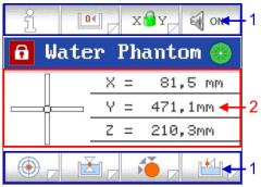 Press Water Phantom Mode button to open the water phantom main menu. It displays the soft key menu icons on the top and bottom and the current detector position in the middle. Only the coordinates of the axes that are connected / present to the phantom are shown (same for the detector position displays in other menus).