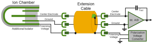 Floated: The floated input clamps the outer chamber wall on ground potential, and provides the polarization voltage through the inner (collecting) electrode. Therefore, the electrometer amplifier is on polarization potential, and needs an isolating amplifier to provide analogue output. The extremely low current, initiated inside the chamber by radiation, forces the use of high sophisticated guarding techniques, in order to make the entire system (chamber, cable, connectors and amplifier) usable in clinical routine.