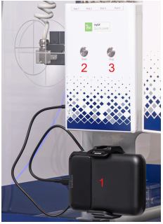 - Connect the quick coupling of the water reservoir hose (1) to the counterpart on water phantom (2), which is located at one bottom corner of the phantom; push in until it snaps on.