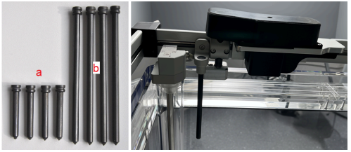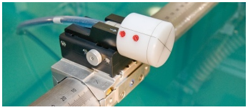 - Ensure that at the starting corner the diode is exactly at the water surface, use the manual leveling pin to adjust the mechanical frame vertically so that the lines on the cap again form a precise cross.
