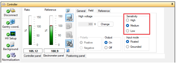 The CCU-X electrometer panel provides three different, independent selectable sensitivity ranges for the Field and Reference channels: