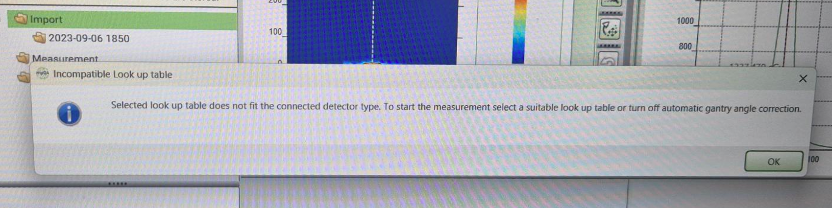 Selected look up table does not fit the connected detector type. To start the measurement, select a suitable look up table or turn off automatic gantry angle correction