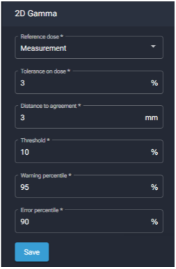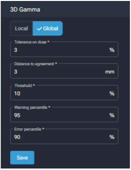 Error percentile | Percentage of voxels that need to pass the gamma test. If the number of voxels that pass the test is above, then the test is passed or on warning, as 2D Gamma. Otherwise, an "error" is displayed in the results of the gamma analysis. |