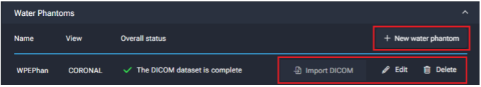 - Add a water phantom by clicking New water phantom. Create a name and select a default view (Axial,