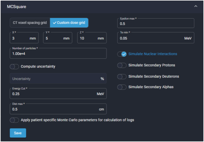 Under the MC tab the user can set the parameters for MCSquare (PT only), Gate (Carbon only), SciMoCa (RT only), and 3D Gamma calculations.