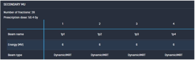 Beam information is available from SciMoCa under the Secondary MU tab. Click on the Geometry, Dose Check, and Complexity Scores tabs different tabs to view the information. The top of the Secondary MU tab displays information from the TPS: