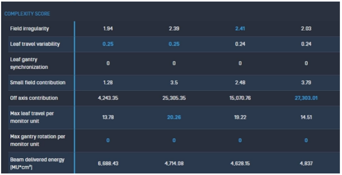 Please note, if more than one beam is present in the plan, the maximal value for each field is highlighted in blue.