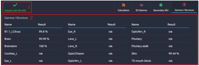 The Gamma per Structure represents the individual gamma analysis results for each ROI within the contour with DICOM type External. To assess the impact of each structure in comparison to the TPS, the Gamma / Structures tab lists the individual results of all the structures present in the body of the patient (2). It is the responsibility of the user to check all values and ensure they are acceptable based on the structure and patient.