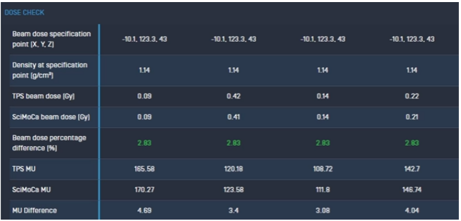 - TPS and SciMoCa beam dose and the beam dose percentage difference between the two.