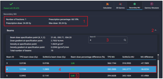 Beam information is available from SciMoCa under the Secondary MU tab. The top of the Secondary MU tab (1) displays information from the TPS: