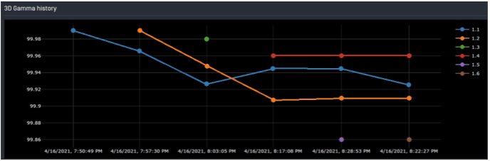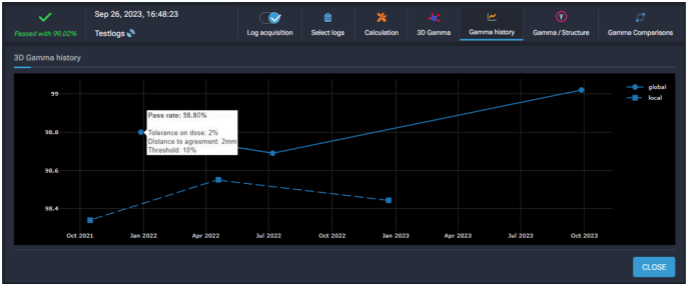 The Gamma History shows the full history of the patient's dose evaluations. Hover the cursor over a specific evaluation to see the passing rate.