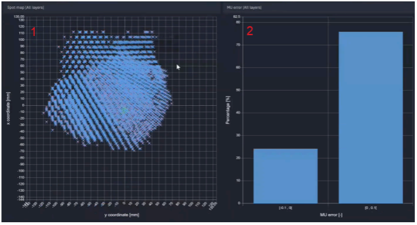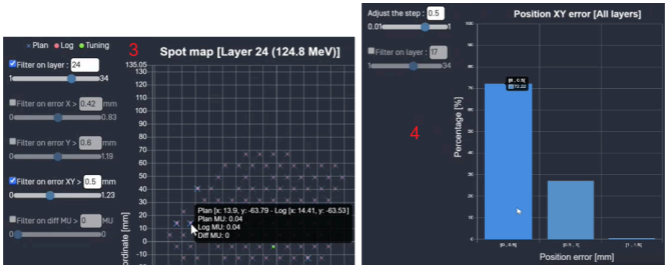 Spot Map Comparison allows users to check the irradiation logs by clicking through layer by layer. The MU and Position Error (X, Y, and XY) graphs show the probability distribution of MU and position errors.