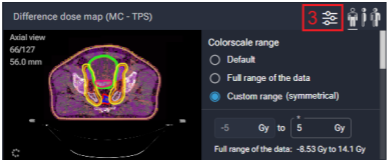 On the Difference dose map, click on the colorscale icon (3) to open the Colorscale range window.