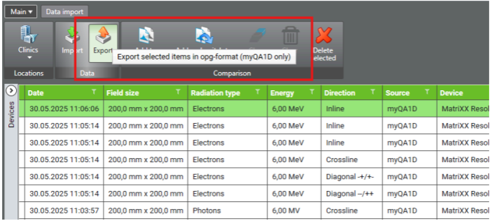 Measurements performed in myQA Machines (automatically available in Data import workspace) or myQA FastTrack (if saved to database) can be exported through myQA Platform.
