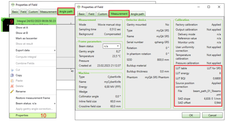To view the measurement settings or the incident angles, right-click the image in the list (9), then click Properties (10) in the context menu to open the Field of properties.