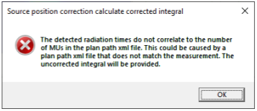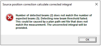 When applying a source position correction to a measurement, the number of beams of the measurement will be compared to the number of beams in the plan path *.xml file. If there is a mismatch, no correction will be applied. An error message will appear: