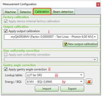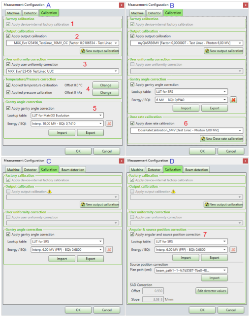Some details in the Calibration tab may vary depending on the treatment machine type and the measurement device selected: