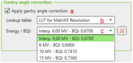 Select the lookup table (iii) and energy / BQI (vi) for angular correction. It is recommend to use BQI = 0.68 for 6 MV (FFF).