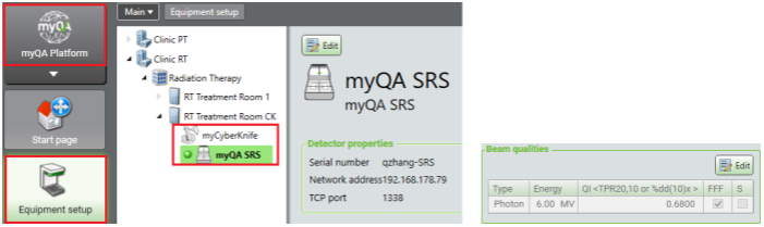 The Cyberknife and myQA SRS device have been defined in the myQA Platform > Equipment setup workspace (see Chapter 4, myQA Platform Instructions for Use).