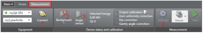 Open the Measurement ribbon. In the Equipment group, select the myQA SRS and the machine, and then click Connect (1).