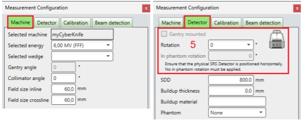 For measurements with a Cyberknife machine and an SRS Detector with a 3D GS+ angle sensor, ensure that the physical SRS Detector is positioned horizontally.