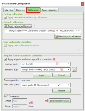 Ensure you are selecting the path.xml file from the correct folder. The plan ID is visible when opening the file.- If the SAD correction parameters should be replaced, click the Edit detector values button (vi) and then enter the new values in the corresponding boxes (vii). See Section 6.1.5, myQA Platform Instructions for Use, for the instructions on determining these parameters.