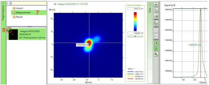 button, and the integral will be stored in the Measurement folder (7).A green tick (8) indicates the angular and source position corrections have been applied.