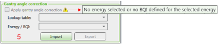Select the lookup table and energy / BQI for angular correction. For details, see sub-section, 5: Gantry angle correction, above