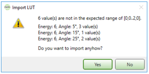 The factor values in a LUT should be between 0 and 2.0. When a LUT containing out-of-range factors is imported, a warning will pop up showing the number of the out-of-range factors and their locations (see an example below).